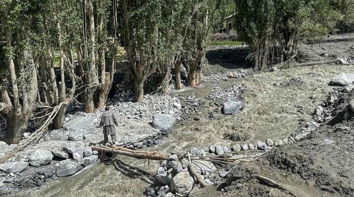 امیج میں دکھایا گیا ہے کہ ایک شخص 24 جولائی ، 2025 کو گلگت بالٹستان میں ضلع گھانچے کے سیلاب سے متاثرہ کونڈس ویلی کا دورہ کرتے ہوئے ایک ندی کو عبور کررہا ہے۔-اے ایف پی