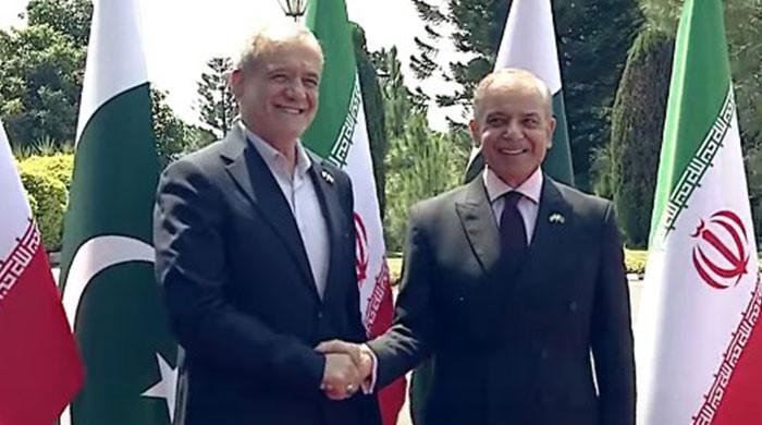 وزیر اعظم شہباز شریف نے 3 اگست ، 2025 کو اسلام آباد میں پی ایم ہاؤس میں ایرانی صدر مسعود پیزیشکیان سے مصافحہ کیا۔ – جیو نیوز کے ذریعے اسکرین گریب