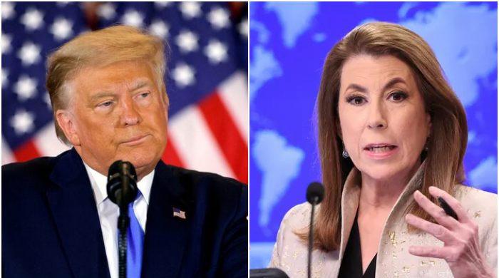 ایک کولیج جس میں امریکی صدر ڈونلڈ ٹرمپ اور محکمہ خارجہ کے ترجمان تیمی بروس کو دکھایا گیا ہے۔ – رائٹرز/فائل
