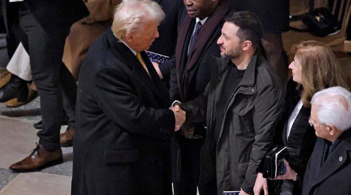 امریکی صدر منتخب ڈونلڈ ٹرمپ اور یوکرائن کے صدر وولوڈیمیر زیلنسکی نے 7 دسمبر ، 2024 کو پیرس ، پیرس میں ، 2019 کی آگ کے بعد ، 2019 کی آگ کے بعد اس کی دوبارہ کھلنے کے موقع پر ایک تقریب سے قبل نوٹری ڈیم ڈی پیرس کیتھیڈرل کے اندر مصافحہ کیا۔-رائٹرز۔