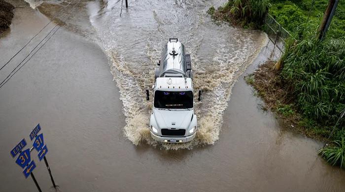 ایک ٹرک سیلاب زدہ سڑک سے گزرتا ہے کیونکہ زمرہ 3 سمندری طوفان ایرن 16 اگست ، 2025 کو پورٹو ریکو کے شہر ناگوبو میں اس خطے کو چھوڑ دیتا ہے۔