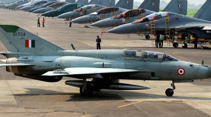 ایئر فورس ڈے کی تقریبات کے لئے ایک ڈرل سے قبل ایک اے ایف مگ 21 کی تصویر سوکھو -30 لڑاکا طیاروں کے ساتھ تصویر ہے۔ – اے ایف پی/فائل