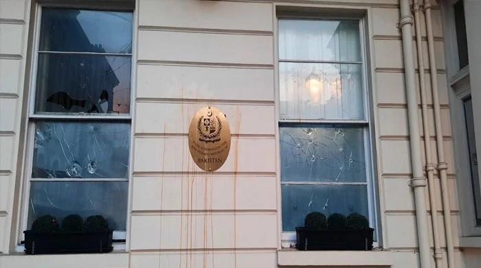 لندن میں پاکستانی ہائی کمیشن کے ونڈوز کے ٹوٹے ہوئے شیشے دیکھے جاسکتے ہیں۔ ptptv/فائل