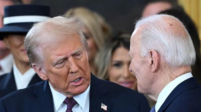 سابق امریکی صدر جو بائیڈن اس وقت دیکھتے ہیں جب امریکی صدر ڈونلڈ ٹرمپ افتتاحی تقریب کے دوران پہنچے تھے اس سے پہلے کہ ٹرمپ نے 20 جنوری ، 2025 کو واشنگٹن ، ڈی سی میں امریکی کیپیٹل روٹونڈا میں 47 ویں امریکی صدر کی حیثیت سے حلف لیا۔ – رائٹرز۔