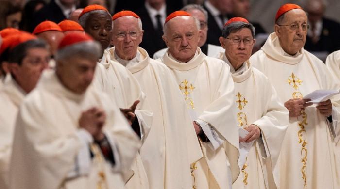 4 مئی ، 2025 کو ویٹیکن میں سینٹ پیٹر بیسیلیکا میں نوینڈی کے نویں دن (پوپ کے جنازے کے بعد نو دن) پوپ فرانسس کے لئے کارڈینلز ایک سوگوار ماس میں شریک ہوتے ہیں۔