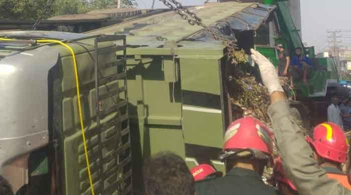- کم از کم چار افراد زخمی ہوئے جب ڈمپر ٹرک آپس میں ٹکرا گیا۔
