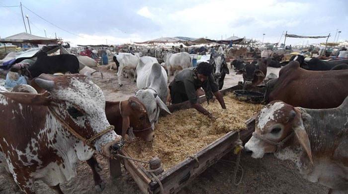7 جون ، 2024 کو کراچی میں عید الدھا سے پہلے ایک فروش نے مویشیوں کی منڈی میں قربانی کے جانوروں کو کھانا کھلانا۔ – INP