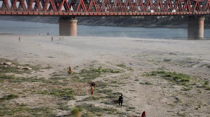 لوگ 24 اپریل 2025 کو حیدرآباد میں دریائے سندھ کے خشک دریا کے کنارے پر چلتے ہیں۔ – رائٹرز