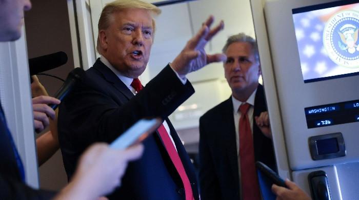 امریکی صدر ڈونلڈ ٹرمپ ، امریکی ایوان اقلیتی رہنما کیون میک کارتی (آر-سی اے) کے ساتھ ، فلوریڈا کے شہر کیپ کینویرل سے واشنگٹن واپس آنے کے دوران ایئر فورس میں سوار صحافیوں سے بات کرتے ہیں۔ – رائٹرز/فائل