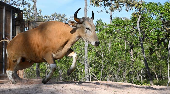 یہ ہینڈ آؤٹ تصویر 13 مئی ، 2025 کو لی گئی ہے اور 23 مئی کو کنزرویشن گروپ رائزنگ فینکس کے ذریعہ ریلیز ہوئی ہے جس میں شمال مشرقی کمبوڈیا کے جنوب مشرقی ایشیاء سے تعلق رکھنے والے ایک قسم کے جنگلی مویشیوں کی ایک قسم کا ہے ، جو شمال مشرقی کمبوڈیا کے سیم پینگ میں ، خطرے سے دوچار پرجاتیوں کے ممبروں کو منتقل کرنے کے لئے ایک ریوڑ آپریشن کے دوران ہے۔ - AFP