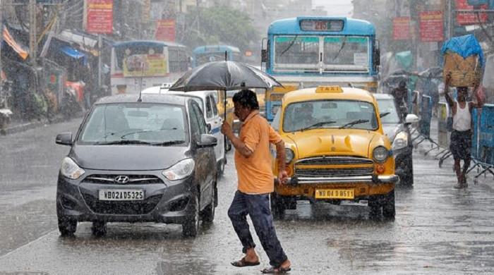 چھتری لے جانے والا ایک شخص بھارت کے شہر کولکتہ میں بارش کے دوران مصروف سڑک کو عبور کرتے ہوئے چلتا ہے۔ – رائٹرز/فائل