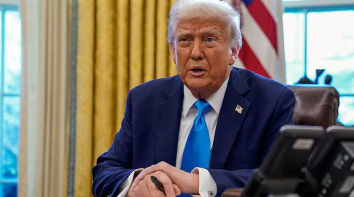 امریکی صدر ڈونلڈ ٹرمپ 4 فروری ، 2025 کو واشنگٹن کے وائٹ ہاؤس میں اوول آفس میں دستاویزات پر دستخط کرتے وقت بول رہے ہیں۔