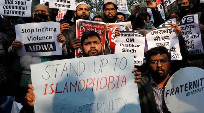 27 دسمبر ، 2021 کو ، ہندوستان کے نئے دہلی میں ، ہندو رہنماؤں کے ذریعہ مسلمانوں کے خلاف نفرت انگیز تقریر کرنے کے خلاف مظاہرین نے ان کے کہنے کے خلاف احتجاج کے دوران پلے کارڈز کا انعقاد کیا۔