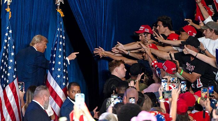 ڈونلڈ ٹرمپ حامیوں کے اشارے کرتے ہیں جب وہ مولٹ ایرینا میں انتخابی مہم کے ریلی کے اختتام پر اسٹیج سے باہر نکلتے ہیں۔ – اے ایف پی/فائل