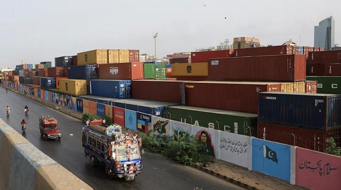 10 جون ، 2025 کو کراچی میں ایک سڑک کے ساتھ ساتھ گاڑیوں کے کنٹینر یارڈ سے گزرنے والی گاڑیاں آگے بڑھتی ہیں۔ – رائٹرز