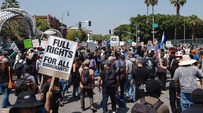 لاس اینجلس: لاس اینجلس میں دن کے مظاہرے کے بعد بدھ کے روز ریاست ہائے متحدہ امریکہ میں ہارڈ لائن امیگریشن کے ہتھکنڈوں پر احتجاج ، جب کیلیفورنیا نے امریکی صدر ڈونلڈ ٹرمپ کی فوج کی تعیناتی پر وائٹ ہاؤس کے ساتھ قانونی نمائش کے لئے تیار کیا۔