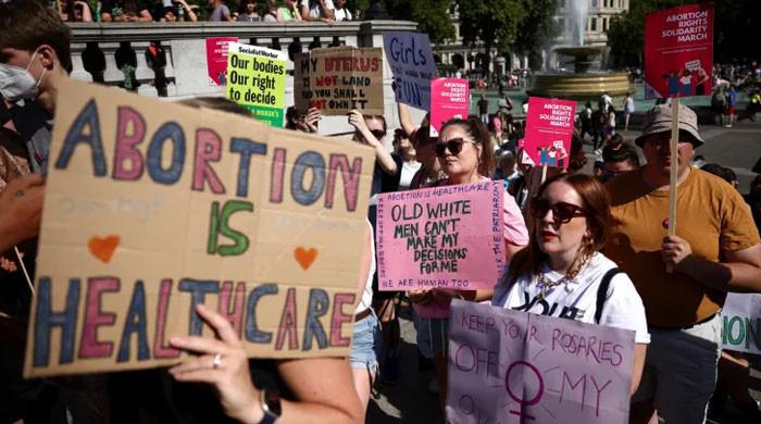 مظاہرین لندن میں اسقاط حمل کے حقوق کی یکجہتی کے مظاہرے میں شریک ہیں۔ – رائٹرز/فائل
