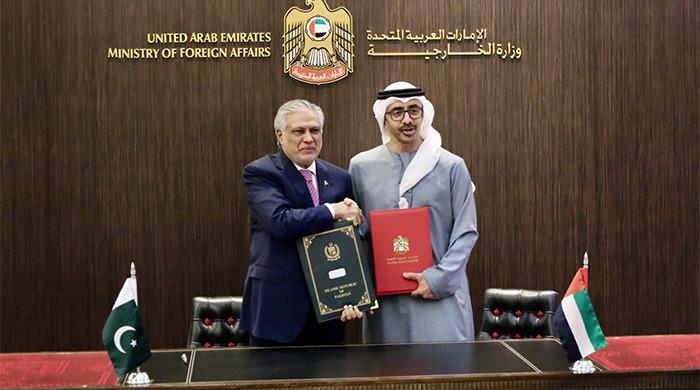 ایک ایکس پوسٹ میں ، ڈار نے کہا کہ اس نے اور ان کے متحدہ عرب امارات کے ہم منصب نے ہمارے دونوں ممالک کے سفارتی اور سرکاری پاسپورٹ رکھنے والوں کے لئے باہمی ویزا چھوٹ سے متعلق معاہدے پر دستخط کیے ہیں۔