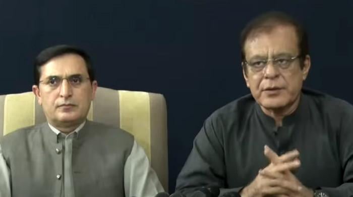 پی ٹی آئی کے چیئرمین بیرسٹر گوہر علی خان (بائیں) اور سینیٹر شوبلی فرز نے 28 جون ، 2025 کو اسلام آباد میں ایک پریس کانفرنس سے خطاب کیا۔ – جیو نیوز کے ذریعے اسکرین گریب