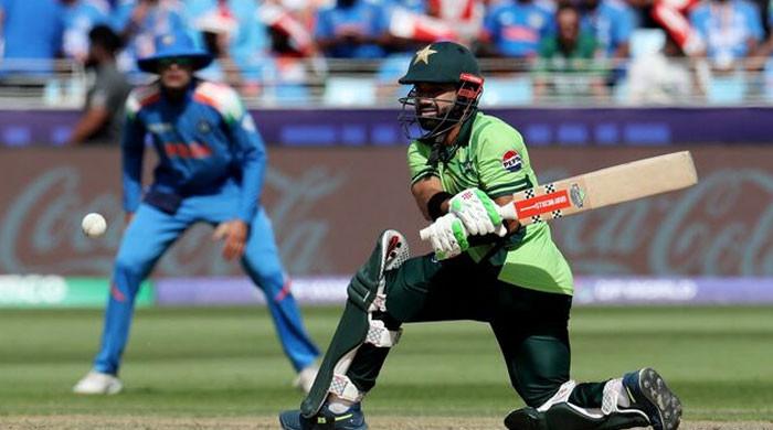 23 فروری ، 2025 کو متحدہ عرب امارات کے دبئی انٹرنیشنل اسٹیڈیم ، دبئی ، میں آئی سی سی چیمپئنز ٹرافی میچ کے دوران پاکستان کے محمد رضوان نے ایک شاٹ کھیلا۔