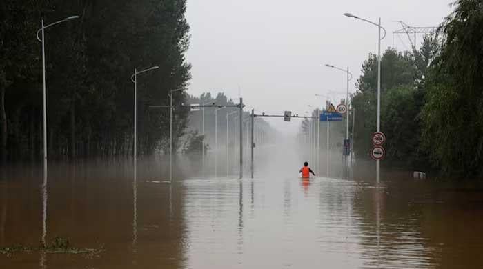 3 اگست ، 2023 کو ، چین صوبہ ہیبی ، صوبہ ہیبی میں ، ٹائفون ڈوکسوری کی باقیات کے ذریعہ بارش اور سیلاب کے بعد ایک شخص سیلاب زدہ سڑک سے گزرتا ہے۔ – رائٹرز/فائل